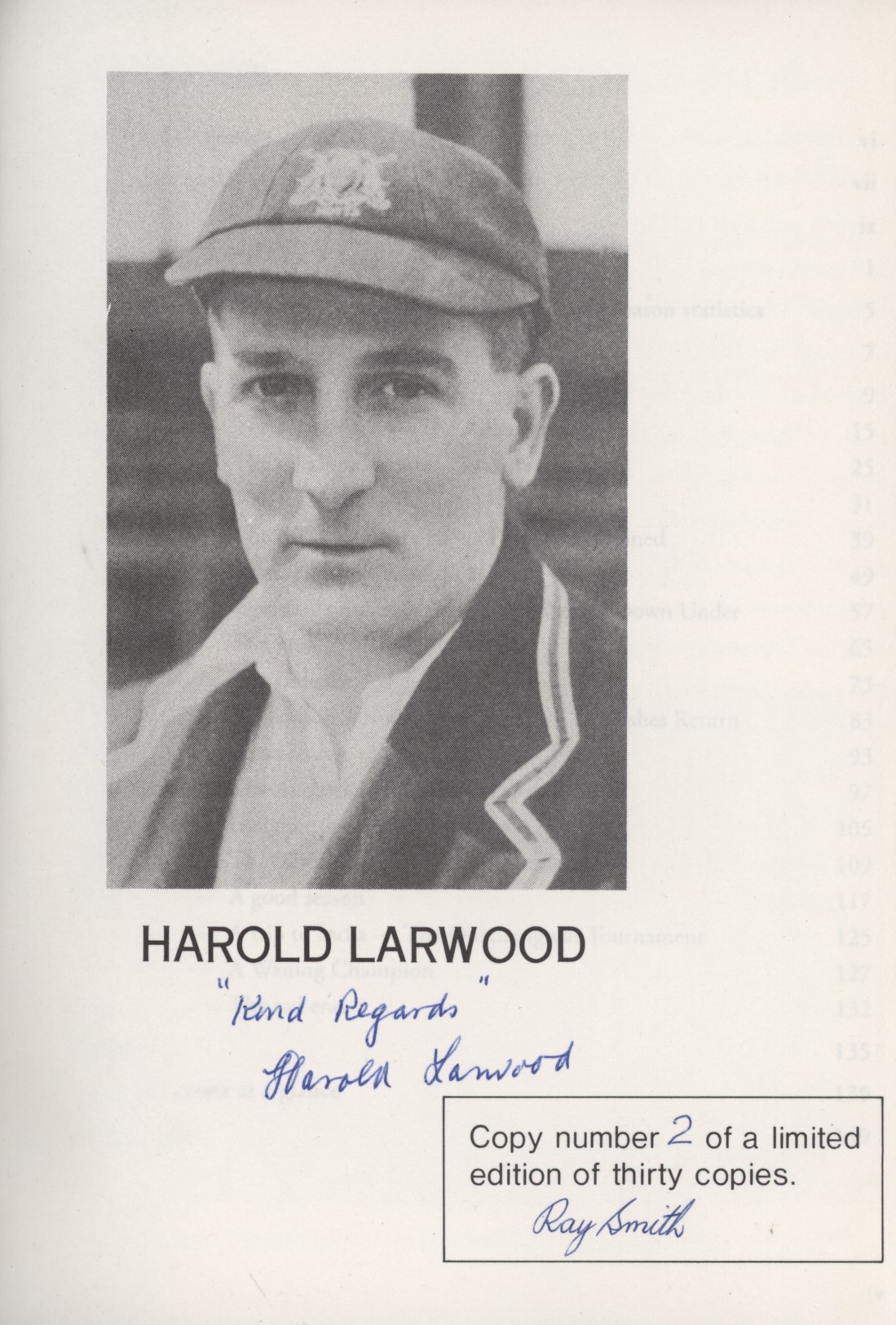 A match-by-match account of Larwood's remarkable cricket career. From a limited edition of 30 hardbound books signed by Larwood and the author - this is number 2. The foreword is supplied by Larwood's daughter Enid Todd. The author had asked Larwood to sign the limited edition pages before his death in 1995, while visiting him at his Sydney home.