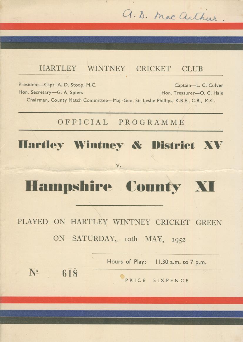 Official programme/scorecard for the match played on Hartley Wintney Cricket Green on May 10th 1952. The home side seemed to get 168 for 13 (declared) and the county team made 210 for 9. Includes an article on "Cricket in the District" by John Arlott.