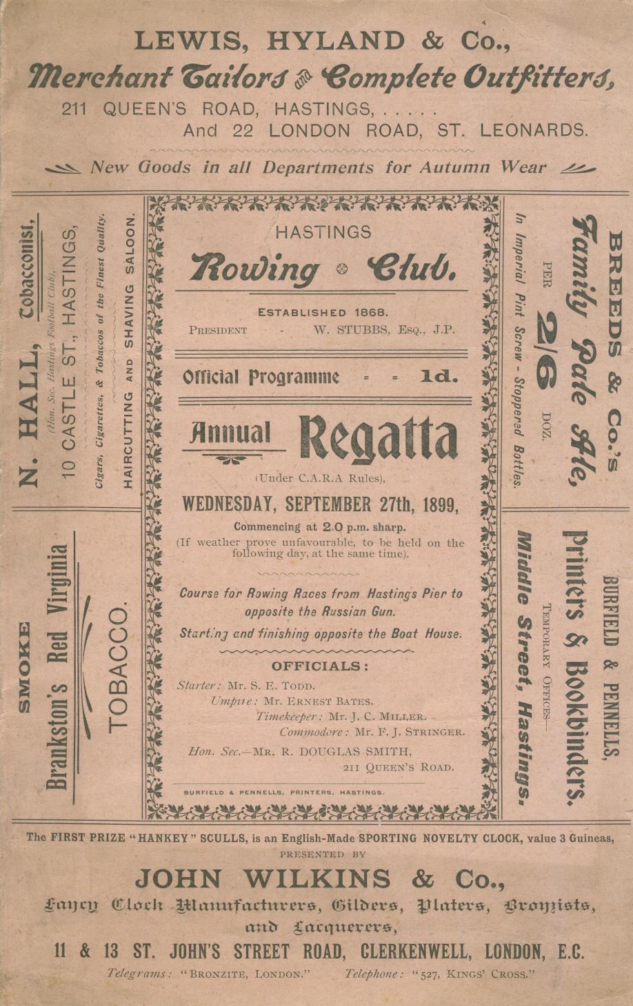 Official programme for the Hastings Rowing Club Annual Regatta, held on September 27th, 1899. Events included sailing races, sculling, one-oar and pair-oar races and a 100 yard swimming handicap race. The competitors included Percy Thomas Ross, who was from a prominent family in the town and had also played football for Hastings and St. Leonards football club.
