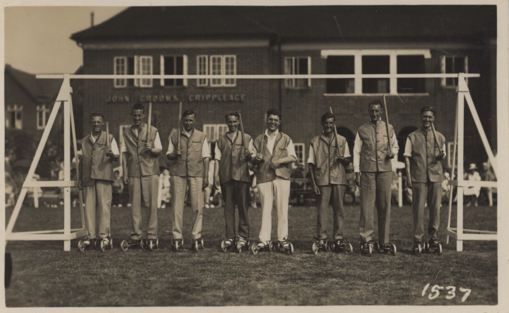 Original postcard of a team of hockey players on wheels. They are photographed outside John Groom's Crippleage, which was an association for disabled people first set up in Edgware, London.