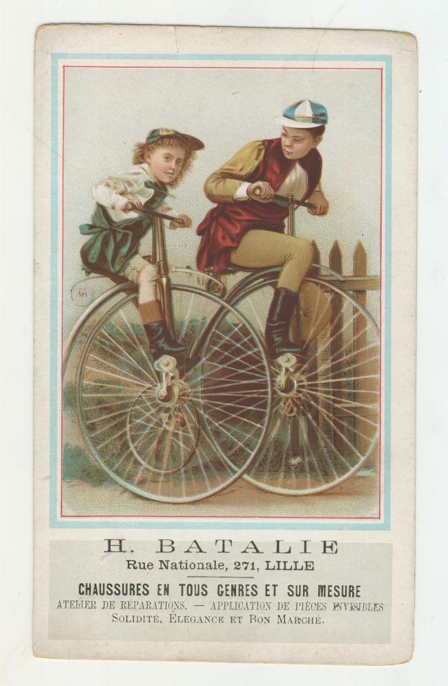 Advertising card for H. Batalie, a shoemakers in Lille, France (still going today). Probably from the 1890s. Shows two children on Penny Farthings.