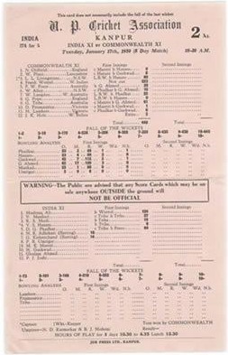 Cricket » Cricket Scorecards » Overseas » INDIA V COMMONWEALTH XI 1950 CRICKET SCORECARD - WORRELL 223