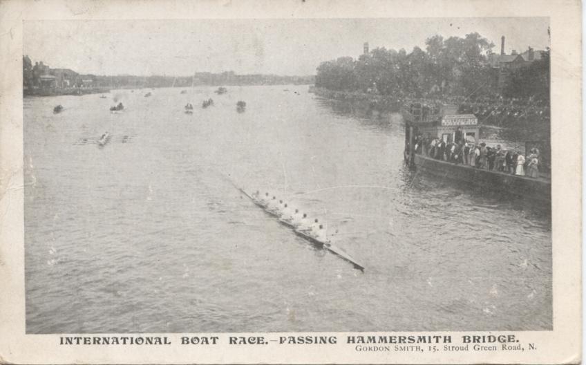 Rowing postcard. Published by Gordon Smith. Titled: International Boat Race Passing Hammersmith Bridge. Postally used and dated 1906, with handwritten message on reverse. In good condition