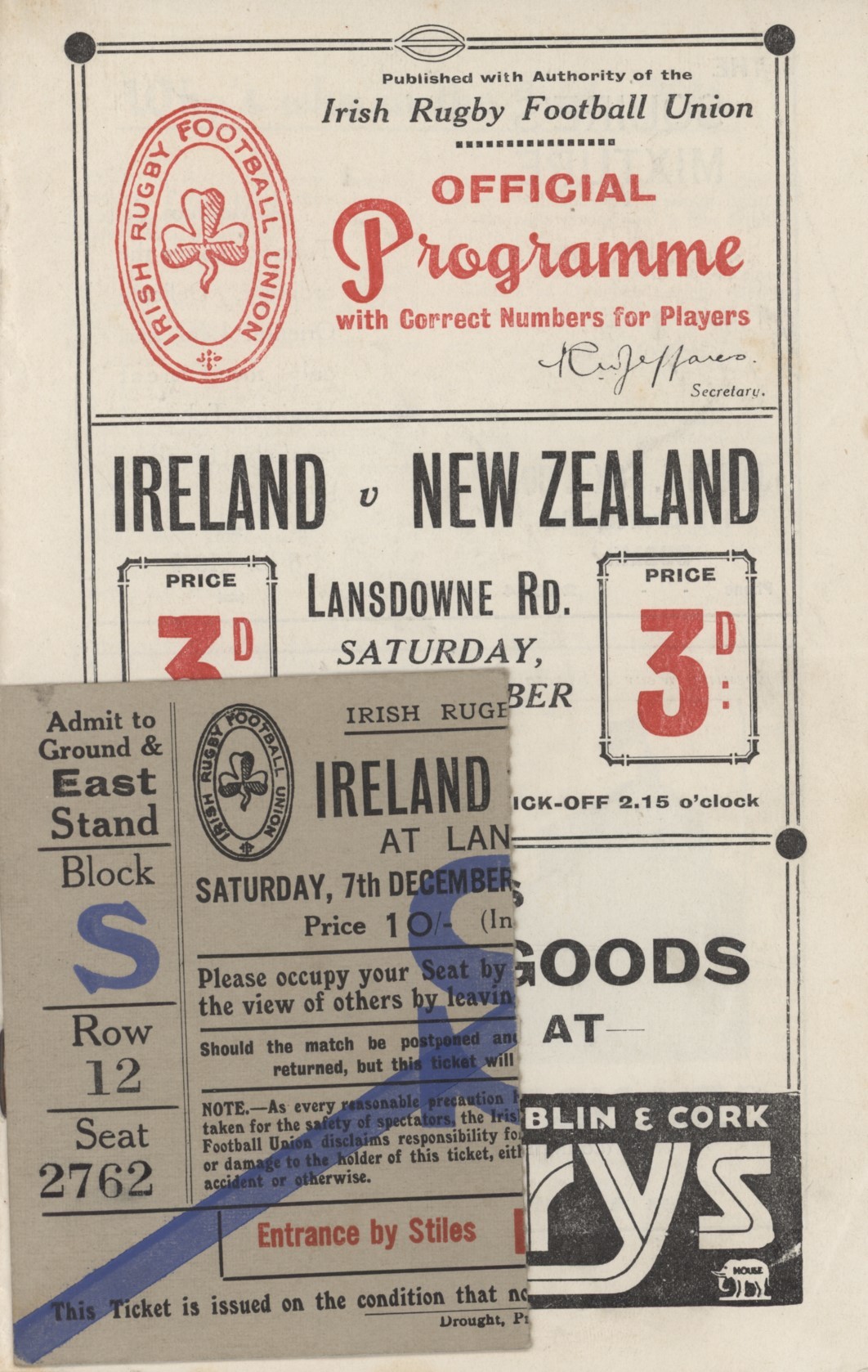 Official programme for the match between Ireland and New Zealand at Lansdowne Road, Dublin, on December 7 1935. This game was part of New Zealand's 1935/36 tour of Britain, Ireland and Canada. The Kiwis won a close game 17-9. Comes with ticket for the game.