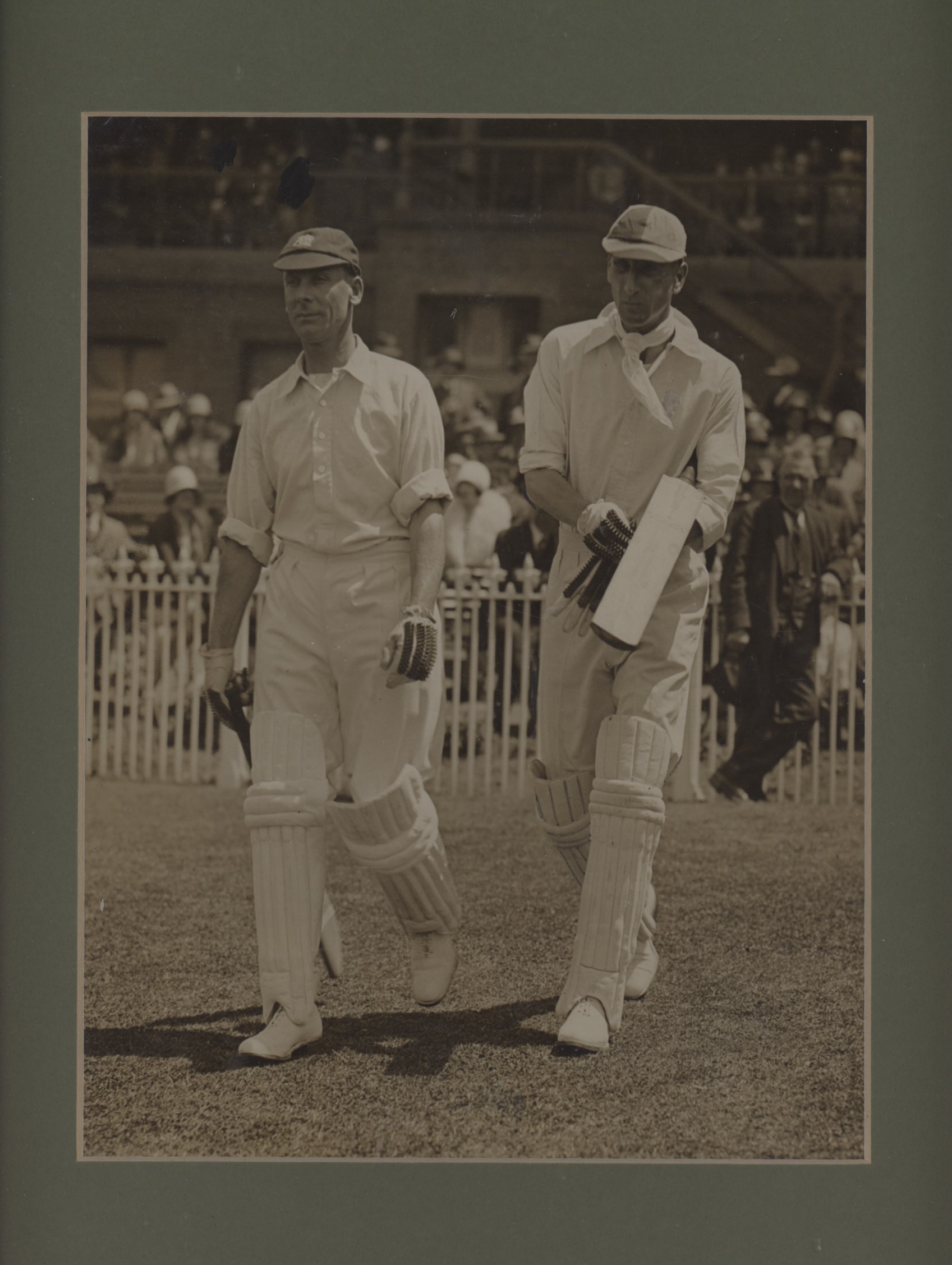 Rare original black and white Press photo of Jardine and Hobbs walking out to open the batting for the only time together for England - Sutcliffe being ill - against Australia in the Fifth Test at Melbourne, Mar 8-16, 1929. They put on 64 (Jardine 19, Hobbs 142) followed by 1 in the second innings (Jardine 0, Hobbs 65); Hobbs's century was his fifth at Melbourne, his 12th against Australia, both records for an Englishman, and furthermore, at 46 years 83 days, he became the oldest centurion in Ashes history. However, Australia won by 5 wickets as consolation after England had won the first four Tests.