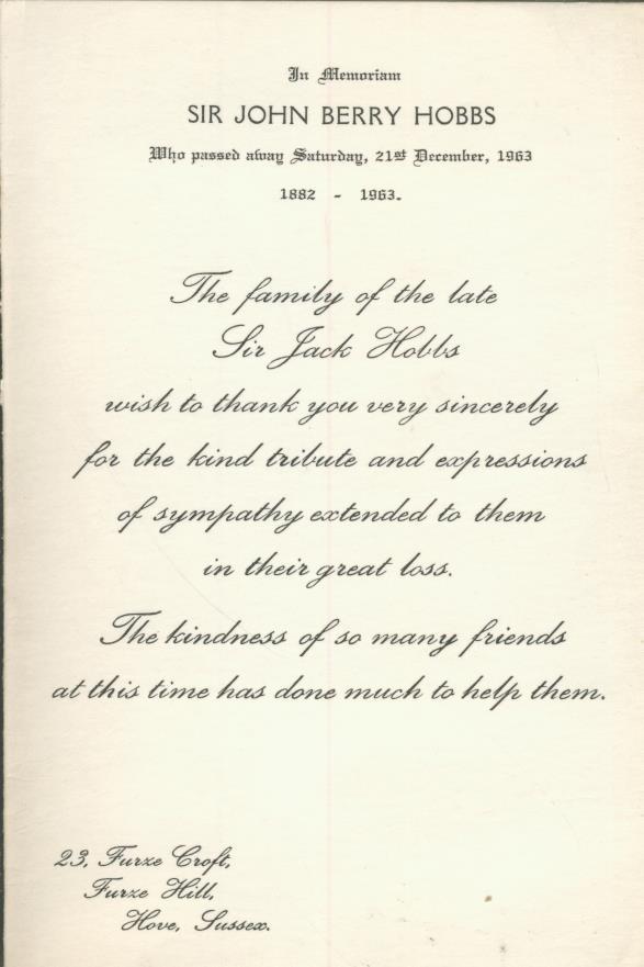 In Memoriam card for Sir John Berry Hoobs, who died on December 21st 1963. Sent by the family of Jack Hobbs to thank for the kindness of friends and for the many kind tributes. Signed to the inside with a short note by Leonard Hobbs, Jack's second son.