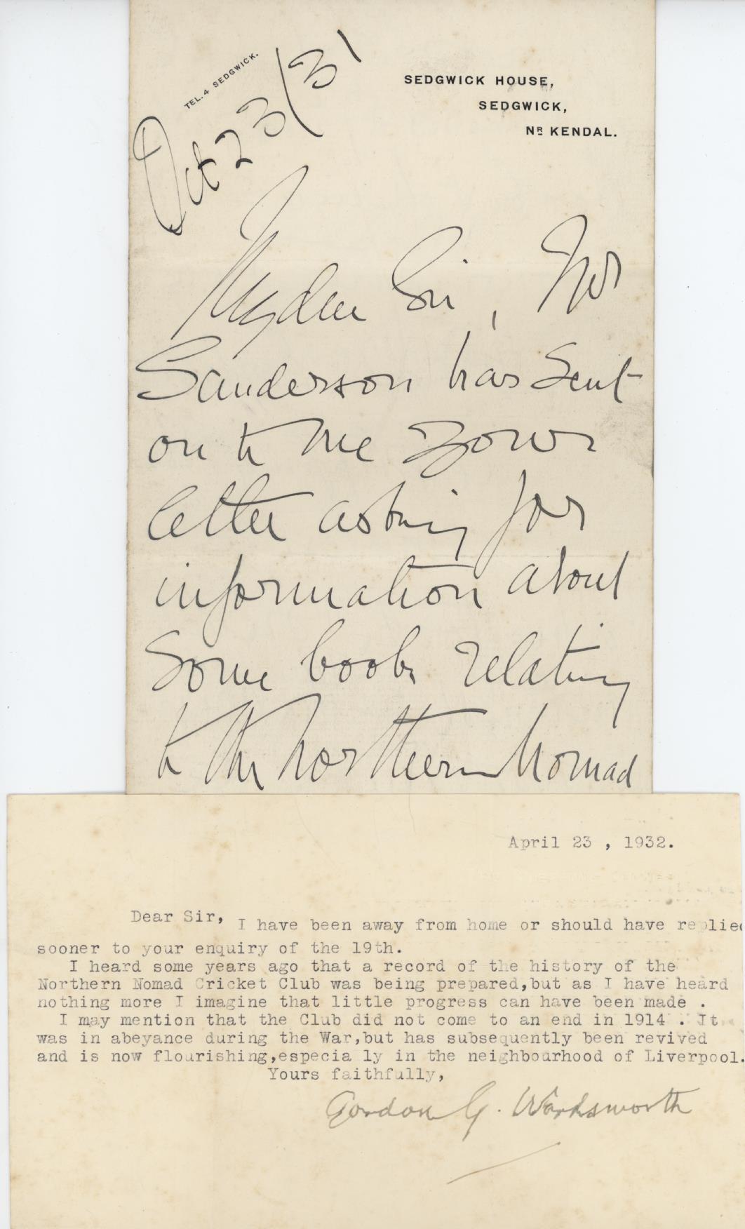 Two letters relating to an enquiry about the Northern Nomad(s) Cricket Club - the recipient was hoping for some information about a possible book that had been published on the club. Jacob Wakefield, of Sedgwick House, referred the recipient on to Wordsworth, who "took much interest in the origin of the club". The letter from Gordon G Wordsworth, who was the last surviving grandchild of the famous poet, could add little, although he did confirm that the club was revived after the Great War "flourishing especially in the neighbourhood of Liverpool".