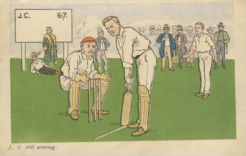 Cricket postcard. Cartoon showing a match in progress with the monocled J.C. on 67 not out. This card was sent to R.M. Bell, who played for London County from 1902-1904.