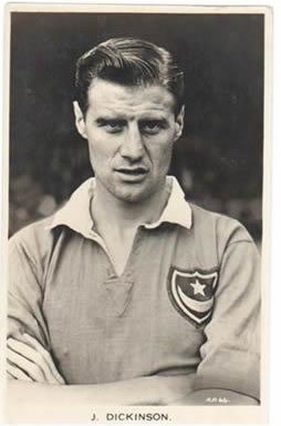 Football postcard. Real photograph by Valentine and Sons, London. Dickinson played 845 times for Portsmouth, scoring 9 goals, playing in their only League Championship  winning teams, and won 48 English caps. Never booked or sent off. White border. Postally unused. Very good.