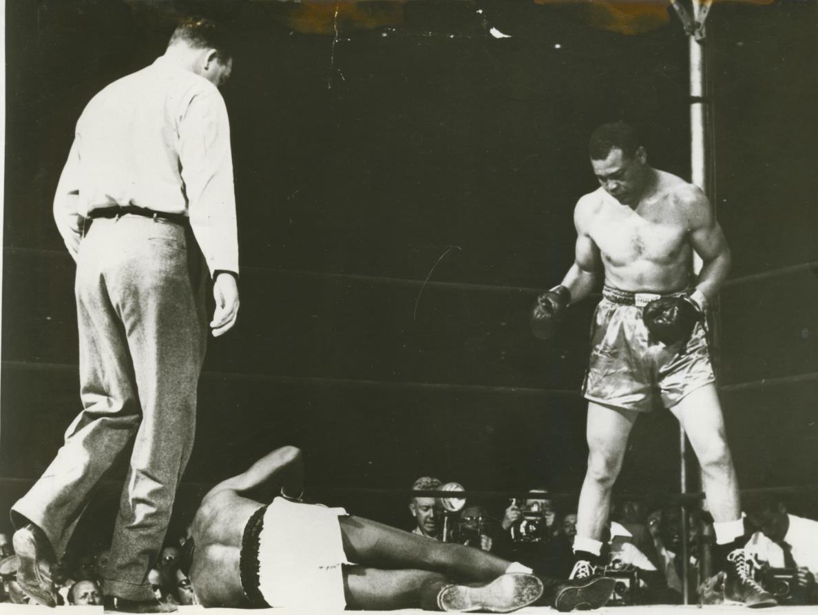Original b/w press photograph of the famous Joe Louis v Jersey Joe Walcott fight in 1948. This shows Walcott lying on the canvas after being knocked down.