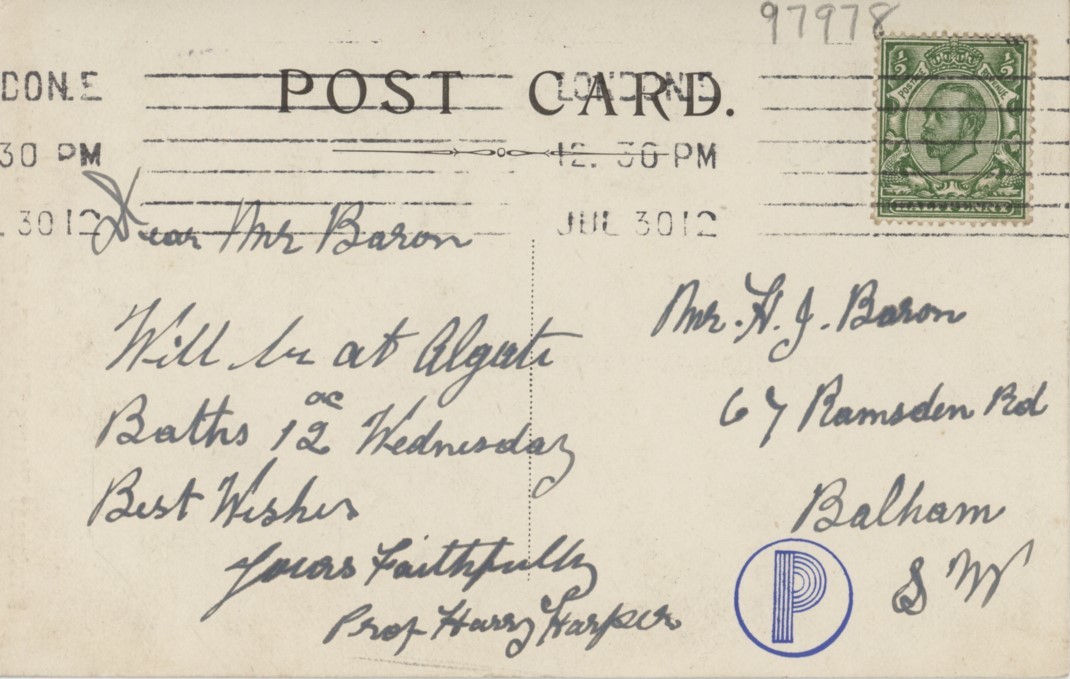 Original postcard. Photographic image of Harper posing in swimsuit. Signed very nicely by Harper in ink to reverse, with a handwritten note confirming his upcoming attendance at Aldgate Baths. The autograph to the front is probably printed but may also be in original ink.