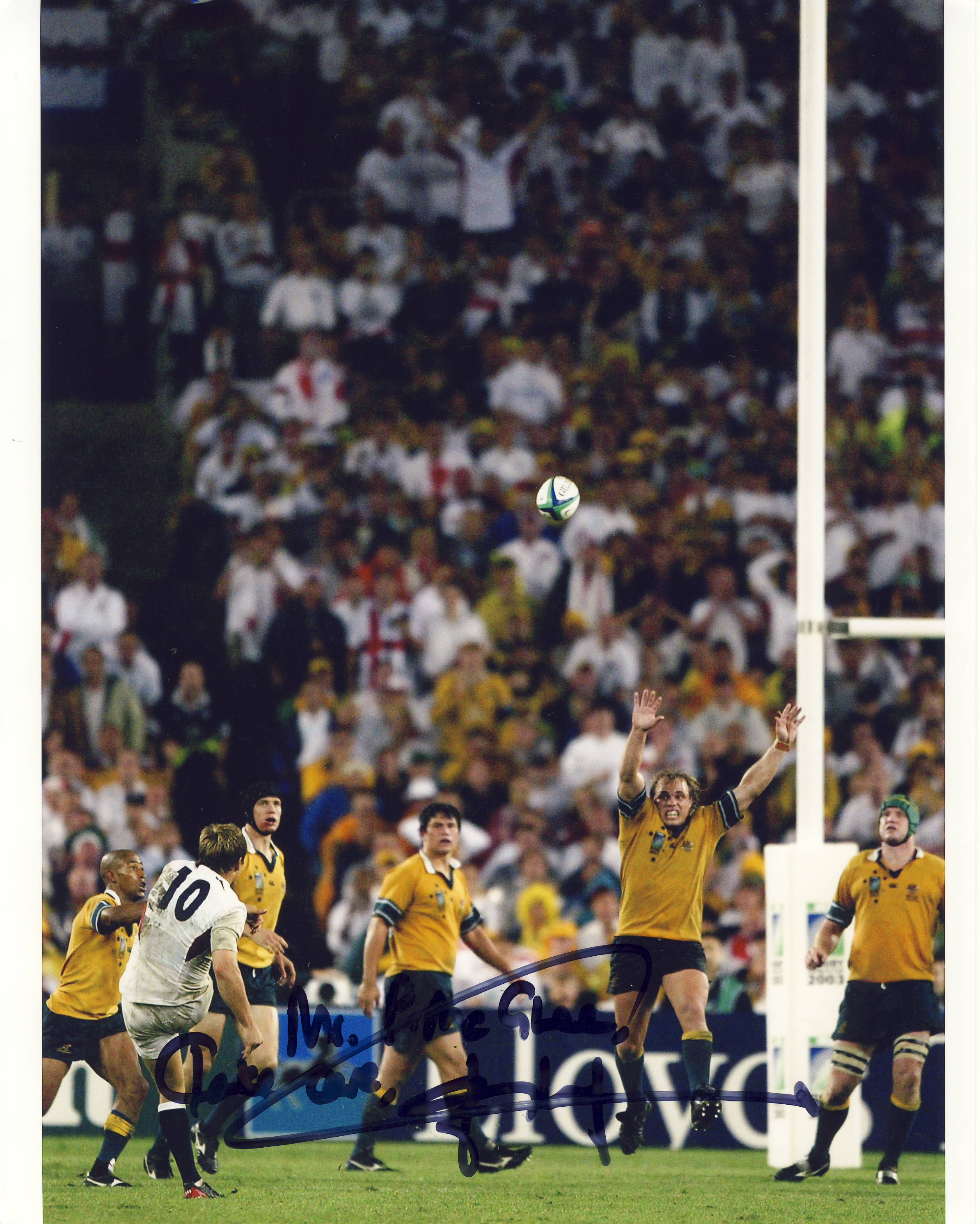 Colour Press photograph of Jonny Wilkinson scoring the winning drop-goal in the 2003 Rugby World Cup final. Signed in ink 'Mr McGill. Take care, Jonny Wilkinson'.