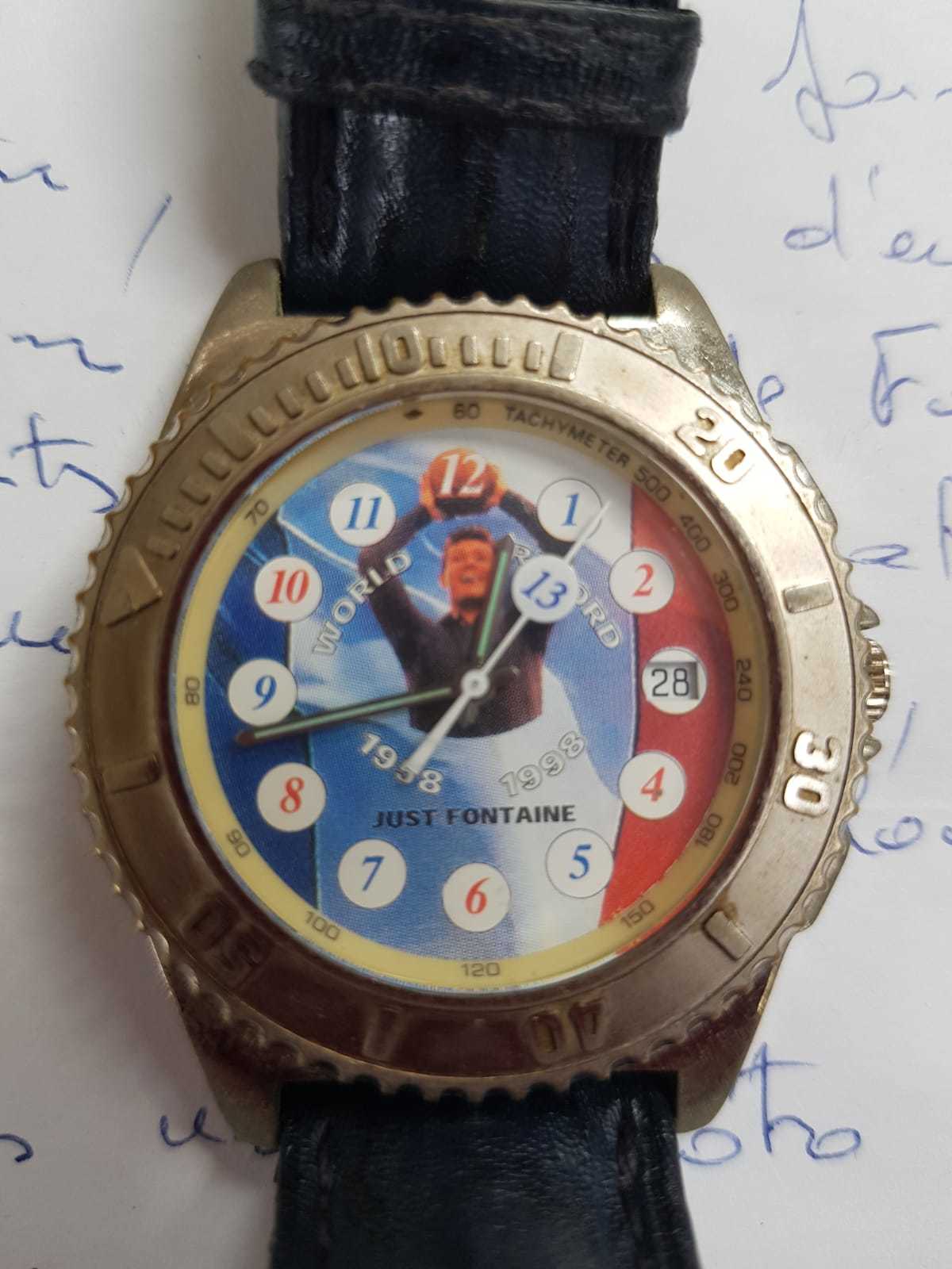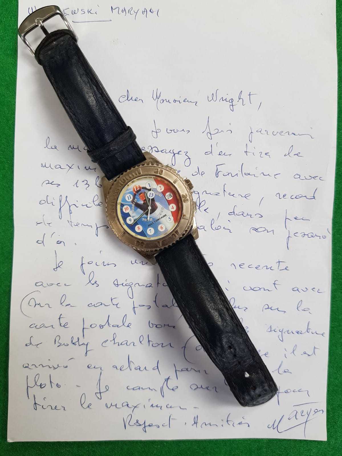 Commemorative wrist watch, inscribed to dial "Just Fontaine. World Record 13 goals 1958-1998", presented to each of the twenty two members of the French 1958 World Cup Squad by Fontaine to commemorate his extraordinary record of scoring 13 goals in a World Cup competition (including 4 against Germany). These were presented after the Final of the 1998 World Cup at the Dinner Banquet. Upon receipt of their watches, each member exchanged with a team mate. Maryan Wisniewski swapped with his room mate Jean Vincent - Wisniewski's World Cup shirt number was '22' and Vincent's '21'. This is number '21', engraved to verso. The details of all Fontaine's thirteen goals are also inscribed to verso. A handwritten letter from Wisniewski (written in French) explains the history of the watch.