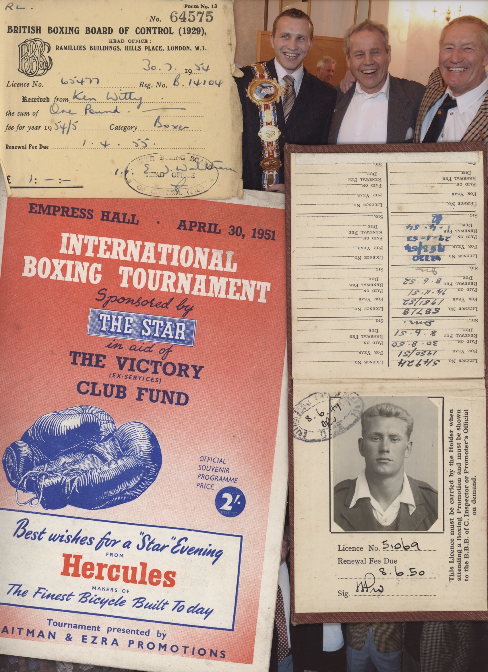 Boxing licence for the Brighton middleweight Ken Wittey, issued in 1949 and renewed until 1954. Also includes some photographs of Wittey in later years (one with Terry Downes), an article about him in a 2000 edition of Boxing News, and a programme from the Ronnie Clayton v Roy Ankarah fight at the Empress Hall on April 30th, 1951. Wittey was on the undercard against Ken Richardson, who he defeated. Wittey's name was often spelt incorrectly, as it was in this programme.