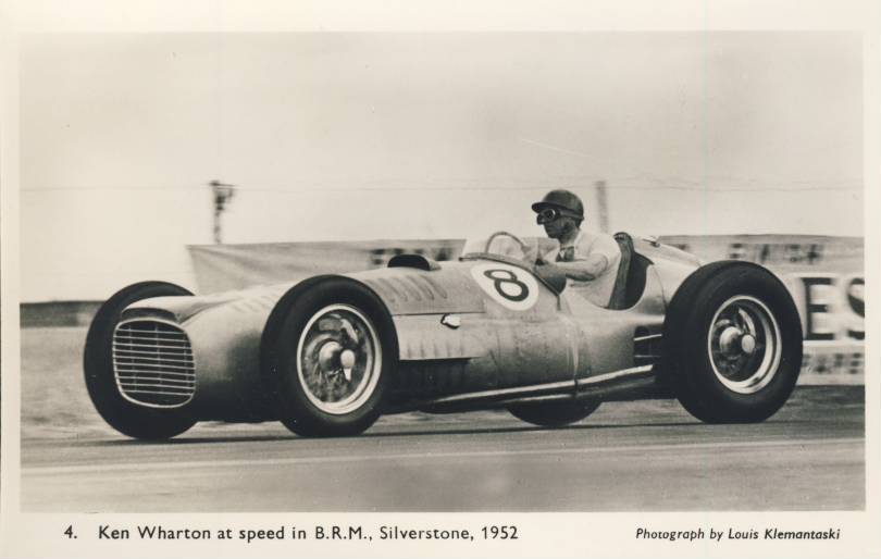 Original postcard. Real photograph by Louis Klemantaski of Ken Wharton in his BRM at Silverstone.