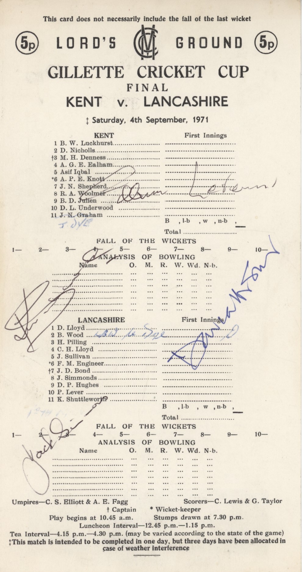 Cricket » Cricket Scorecards » One-day matches » KENT V LANCASHIRE 1971 (GILLETTE CUP FINAL) SIGNED CRICKET SCORECARD
