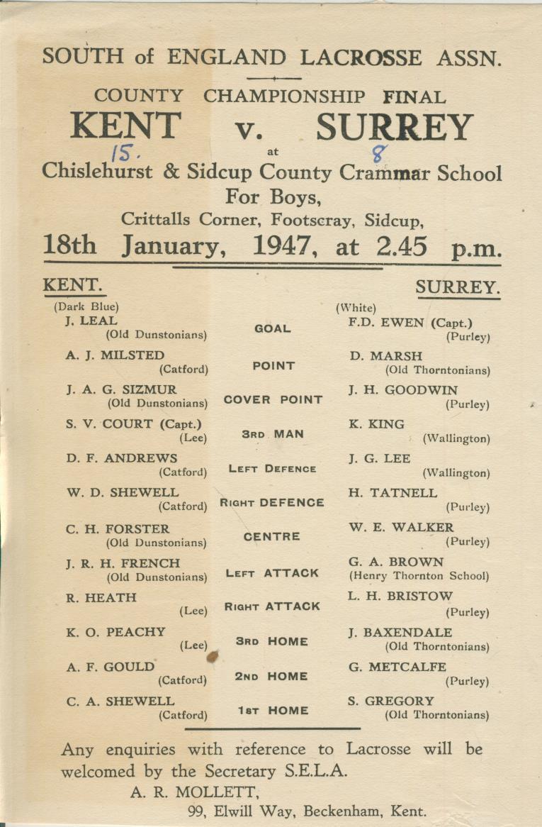 KENT V SURREY (COUNTY CHAMPIONSHIP FINAL) 1947 LACROSSE PROGRAMME