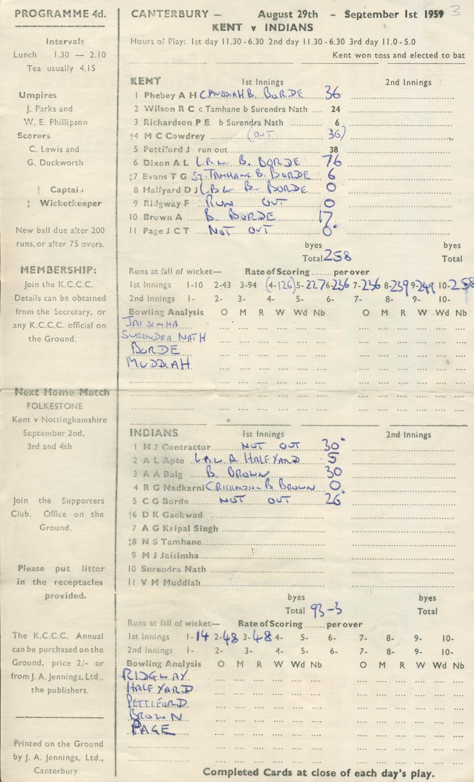 Cricket scorecard from the tour match played at Canterbury, Aug 29- Sept 1st 1959. India won by 8 wickets. Indian Captain DK Gaekwad made a fine first innings century and Borde took 5-44 and 5-42 to leave the Indians needing only 102 to wrap things up. This they did for the loss of only 2 wickets.