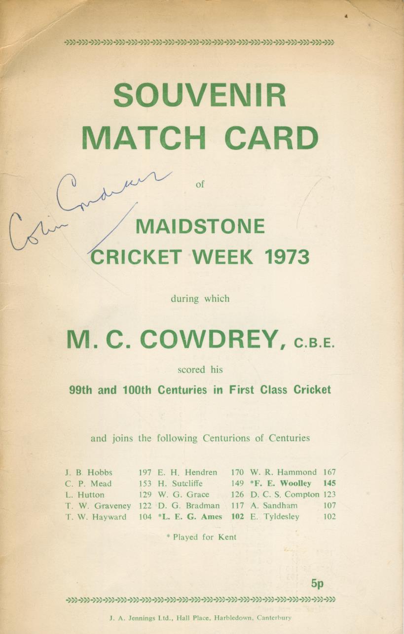 28 x 22cm. Fully printed post-match commemorative card. Signed by Cowdrey in ink to front. Some light staining to edges. Very good.