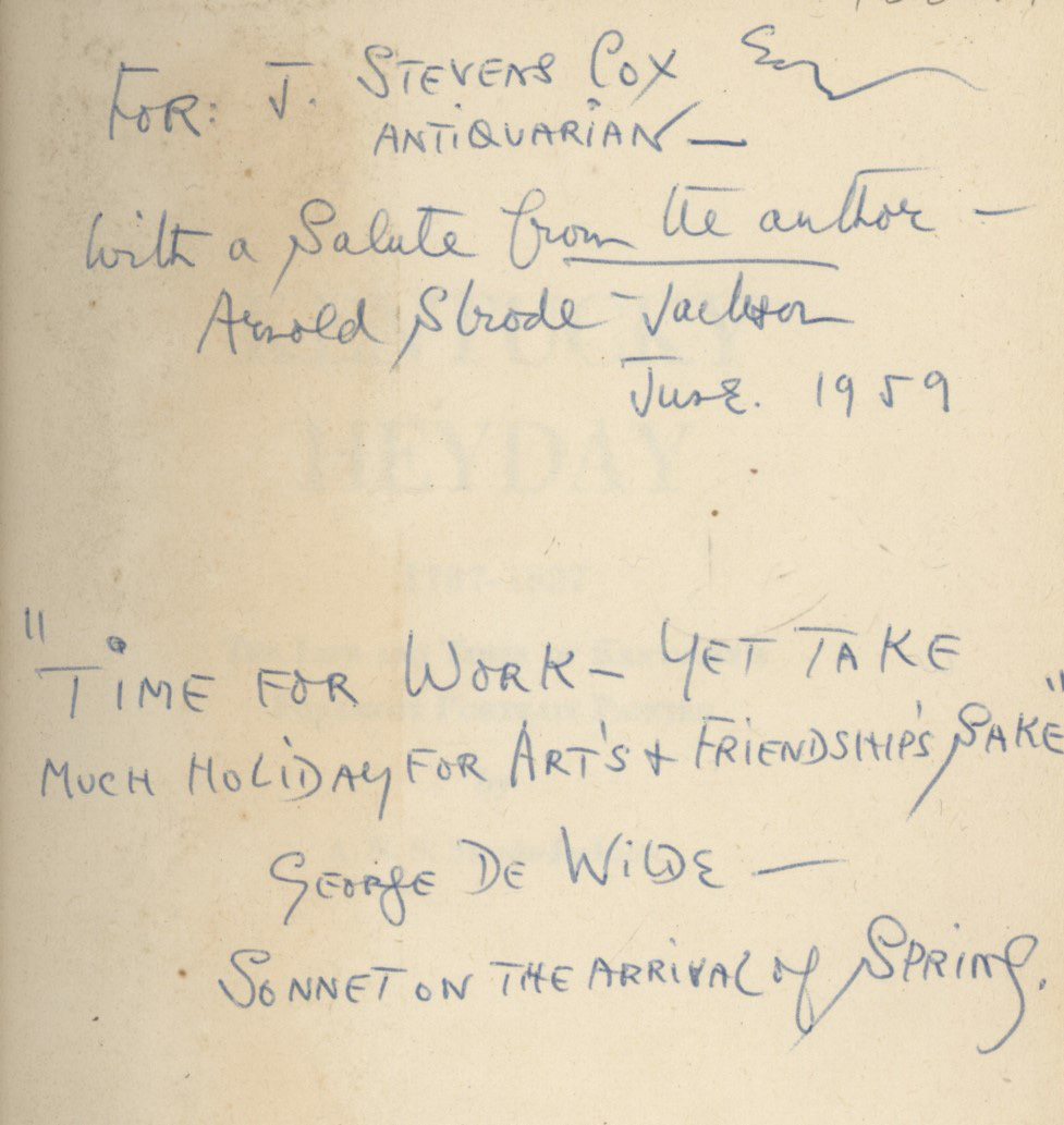 8vo. 387pp. Cloth-covered boards. Minor wear to wrapper. Protected by a plastic sleeve. A very good copy. First edition. Signed by the author to flyleaf with a dedication to the antiquarian J. Stevens Cox and a quotation from George de Wilde.