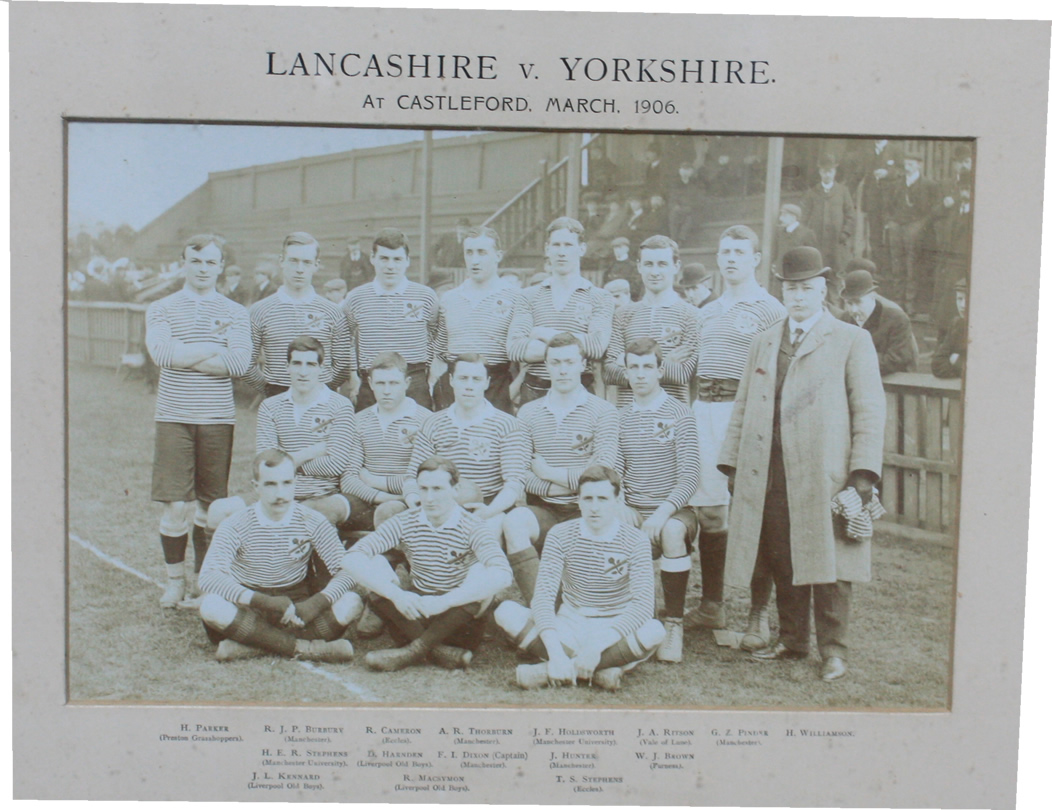 Original sepia photograph of the Lancashire team that played Yorkshire at Castleford in May 1906. The players are Parker, Burbury, Cameron, Thorburn, Holdsworh, Ritson, Pinder, Williamson (manager), Stephens, Harnden, Dixon (captain), Hunter, Brown, Kennard, MacSymon and Stephens.