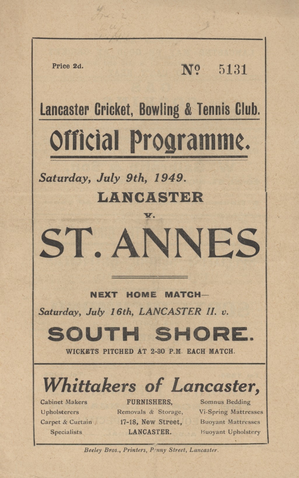 Cricket » Cricket Programmes » Other Cricket Matches » LANCASTER V ST. ANNES 1949 CRICKET PROGRAMME