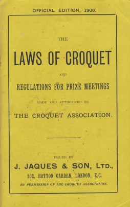 Contains the 1906 version of the official rules of croquet and regulations for prize meetings. The rest of this booklet is made up of advertisements for Jaques' Croquet accessories (sets, mallets, stands and practice targets.)