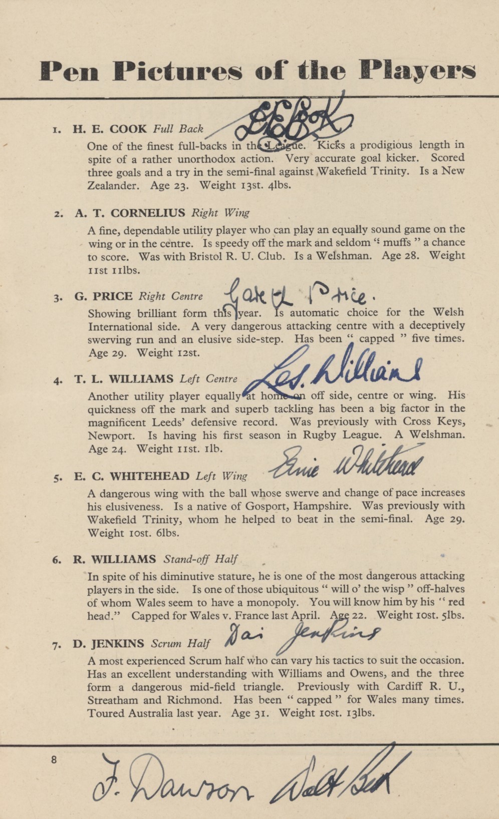 Lightly rubbed with some very small chips to edges, light foxing to covers. Original owner's name to front - Ernie Whitehead, the Leeds left wing. Good condition. Signed to the centre spread in pencil by 7 Bradford players, and to their pen portraits (in ink) by 10 Leeds players. These include Carmichael, Batten, Kitching, Walters, Davies, Ward and Smith for Bradford Northern; and Cook, Price, T.L.Williams, Whitehead, Jenkins, Dawson, Prosser, Clues, Foreman and one other for Leeds.