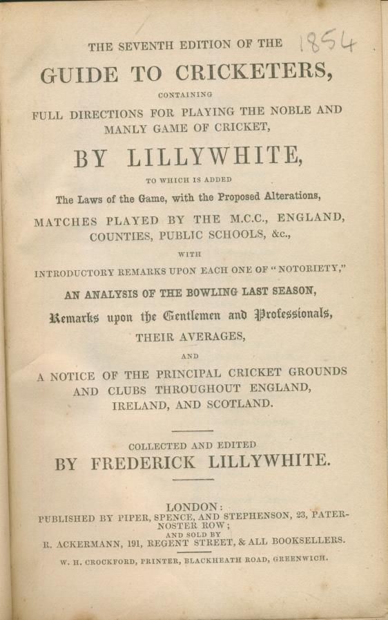 Fred Lillywhite's guides were published annually from 1849 to 1866. The work was subequently incorporated with John Lillywhite's Cricketer's Companion, the third issue of which, published 1867, is called the 23rd edition of the Guide. This is the twenty-first edition.