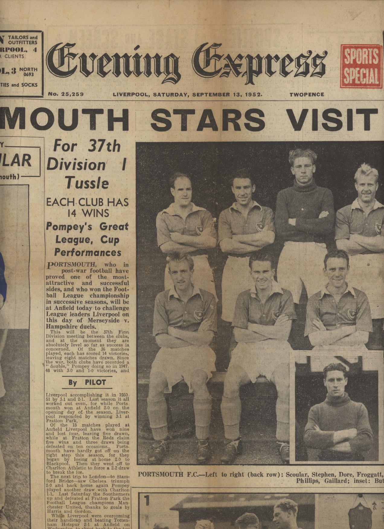 Edition of Liverpool's Evening Express (Sports Special) for September 13th, 1952 - looking forward to the visit of Portsmouth FC to Anfield. Features team photos, line-ups etc. to front page with futher sporting articles etc. throughout.