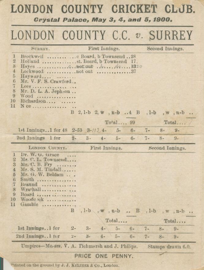 LONDON COUNTY V SURREY 1900 CRICKET SCORECARD