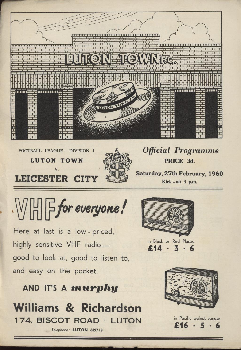 Football programme for the match between Luton Town v Leicester City on 27th February 1960.