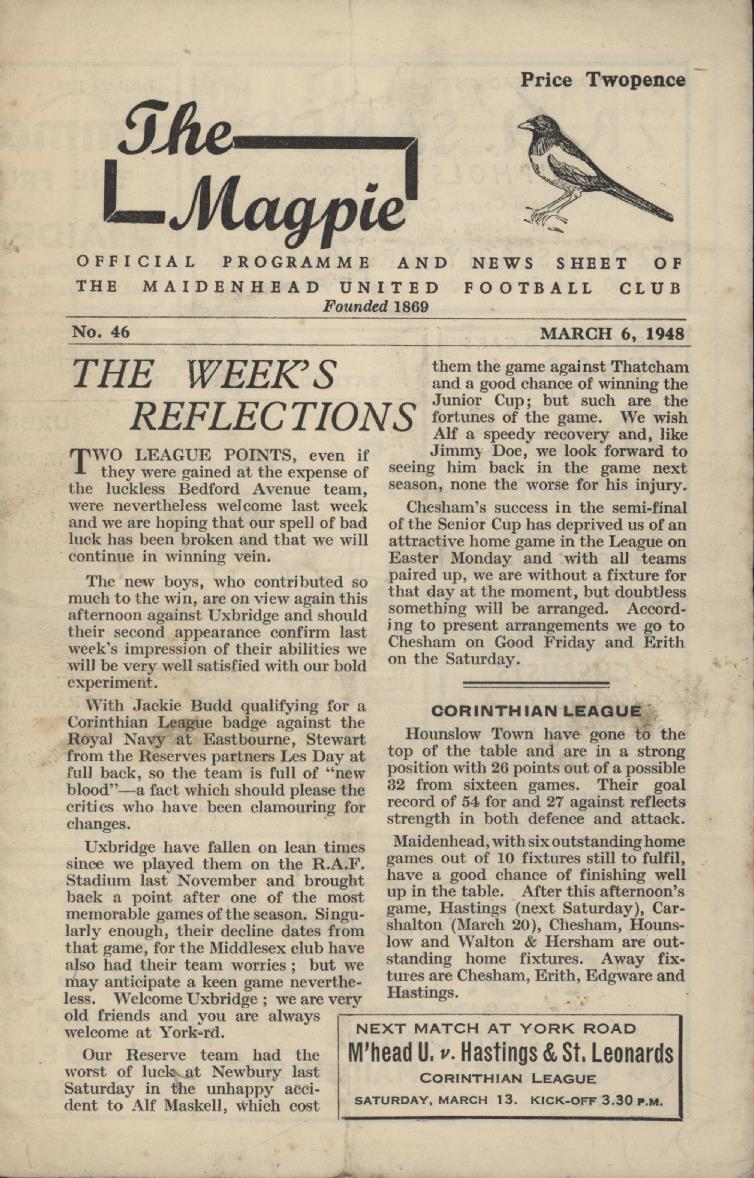 MAIDENHEAD UNITED V UXBRIDGE 1947-48 FOOTBALL PROGRAMME