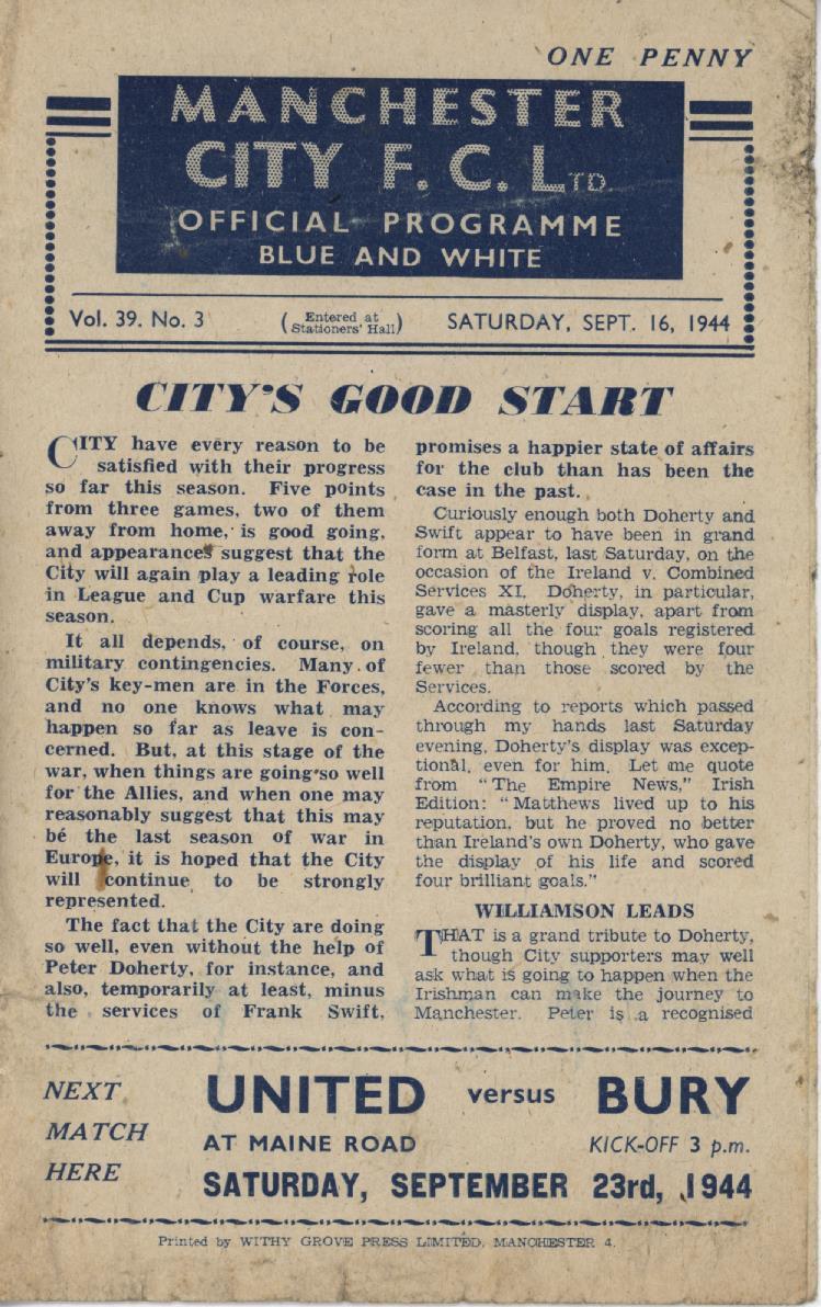 Official programme for the match on September 16th, 1944.