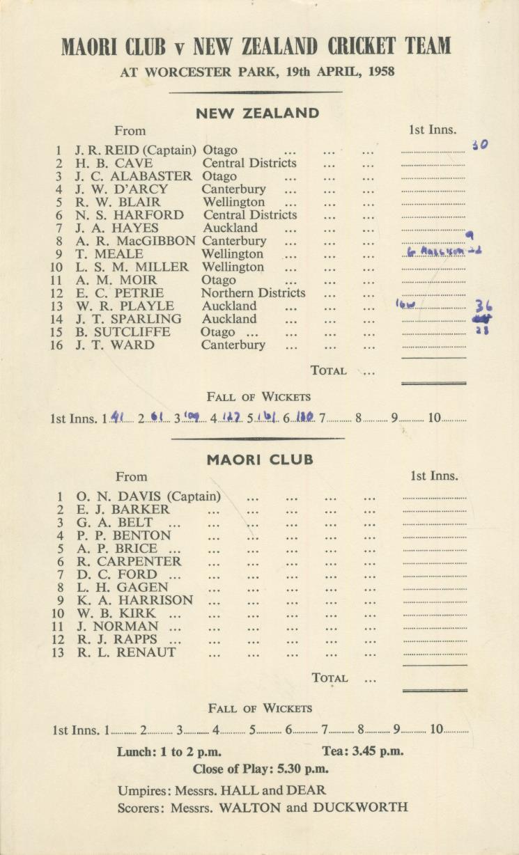 Cricket » Cricket Scorecards » Minor Counties/Clubs » MAORI CLUB V NEW ZEALAND 1958 CRICKET SCORECARD