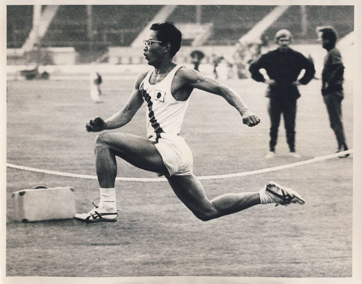 Original black and white athletics photograph of Muraki competing in the Triple Jump at the AAA Championships at White City 1970.