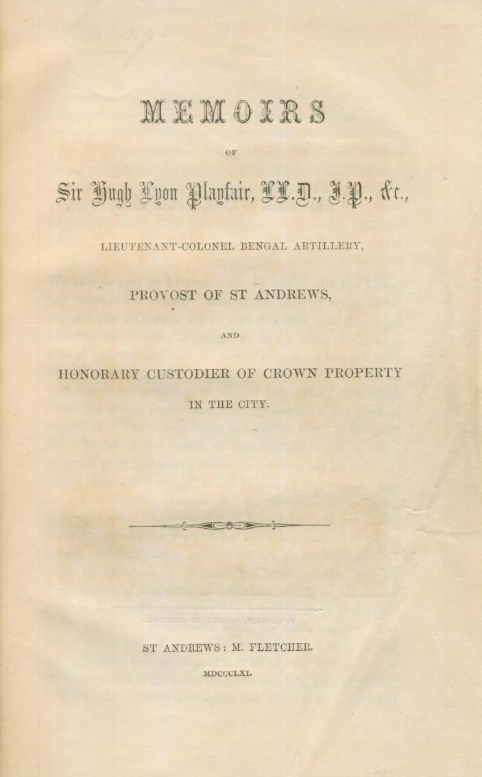 A biographical sketch of Sir Hugh Lyon Playfair, written soon after his death in 1861. It covers briefly his time in the army, serving mainly in India, before focusing on his time as Provost of St Andrews from 1842 onwards. Playfair is credited with instigating many improvements to the town of St Andrews but is perhaps best remembered for his role in reviving The Royal and Ancient Golf Club of St Andrews and, in particular, regenerating the Links. Two pages of the book cover this.