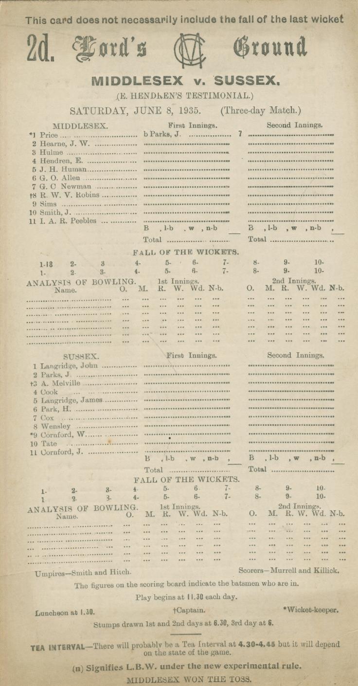 Cricket » Cricket Scorecards » Middlesex » MIDDLESEX V SUSSEX 1935 CRICKET SCORECARD