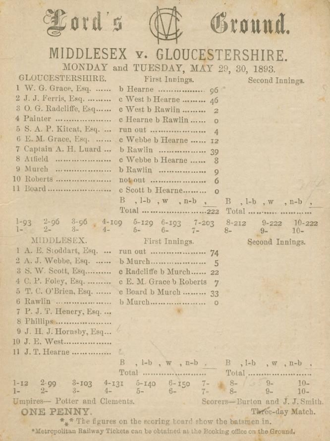 MIDDLESEX V GLOUCESTERSHIRE 1893 CRICKET SCORECARD - GRACE SCORED 96