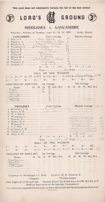 MIDDLESEX V LANCASHIRE 1955 CRICKET SCORECARD