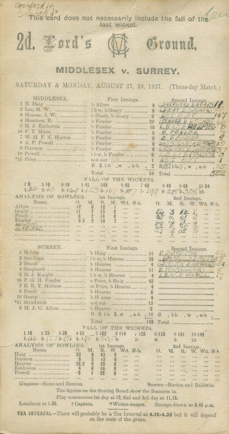 Cricket » Cricket Scorecards » Middlesex » MIDDLESEX V SURREY 1927 CRICKET SCORECARD