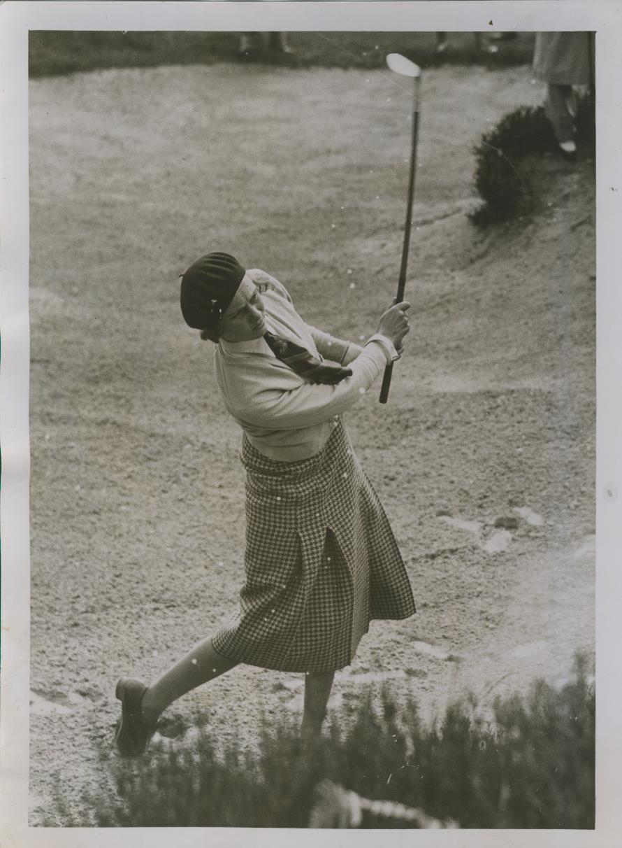Original Press photograph of Mrs Andrew Holm playing out of a bunker during a match in 1933. The caption on the back refers to the upcoming 1934 British Women's Championship Final at Royal Porthcawl, in which Mrs Holm will be competing.