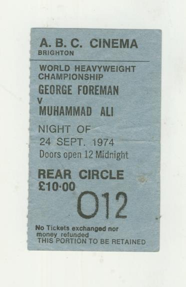 Original cinema ticket stub for the live transmission of the Ali V Foreman fight "The Rumble in the Jungle", dated for the night of September 24th, 1974 - doors opening at midnight. In fact the fight was delayed to October 30th after Foreman was injured in a sparring session but it is probable that this ticket was still valid (and used). The venue was the A.B.C. Cinema in Brighton.