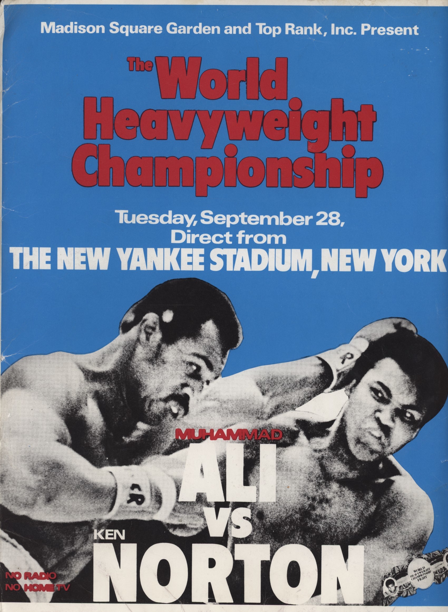 Official Press pack for the Ali v Norton fight for the World Heavyweight Championship at the Yankee Stadium, New York City, on September 28 1976. In their third fight Ali won a close but unanimous 15-round decision. Includes 10 large photographs of the boxers (5 each), two Press releases, "Tale of the Tape" insert, "Fight Form" sheets etc.