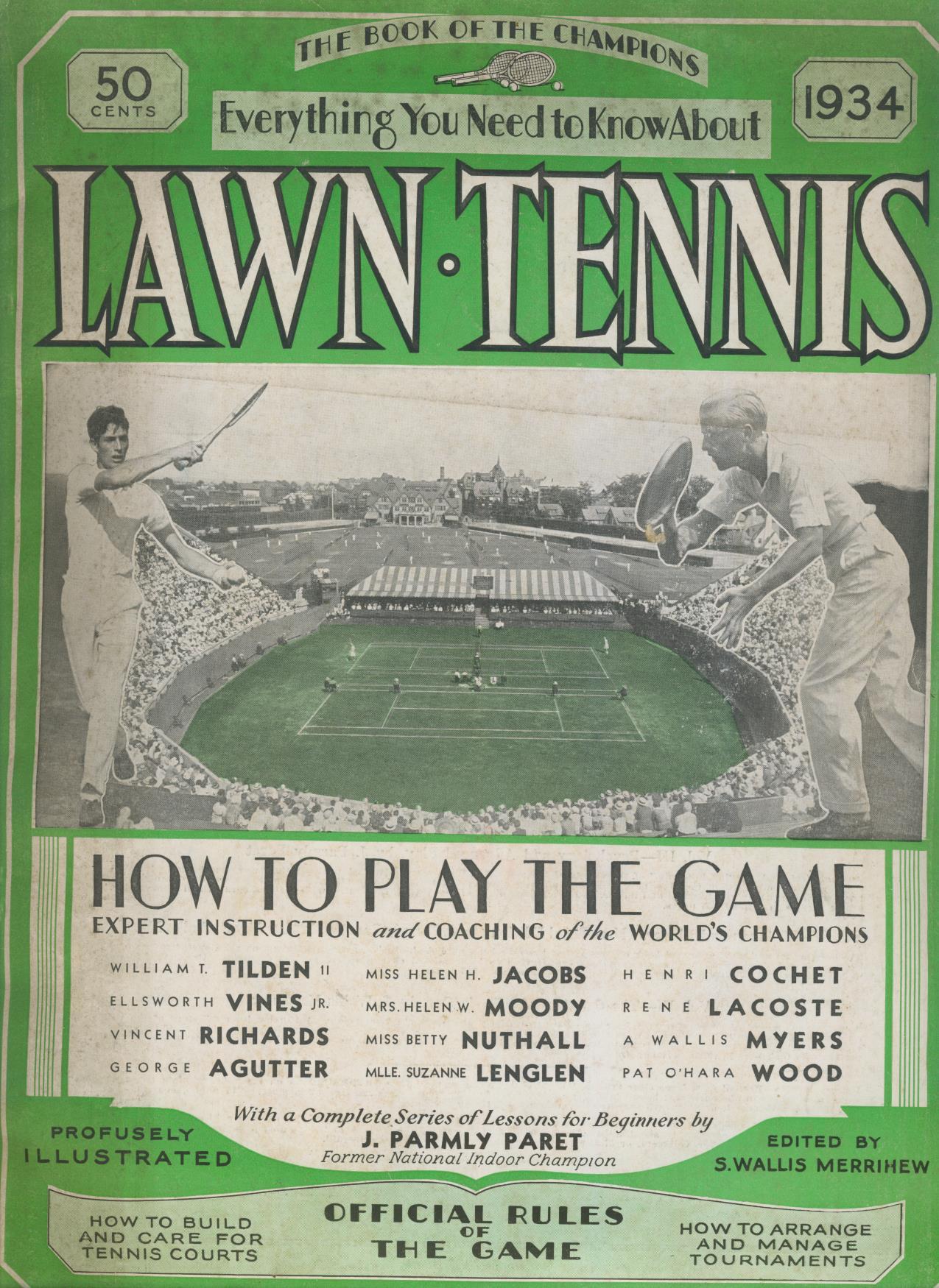 Tennis instructional. Contains many articles, photos etc., with contributors including Tilden, Lenglen, Cochet, Vines and Jacobs.