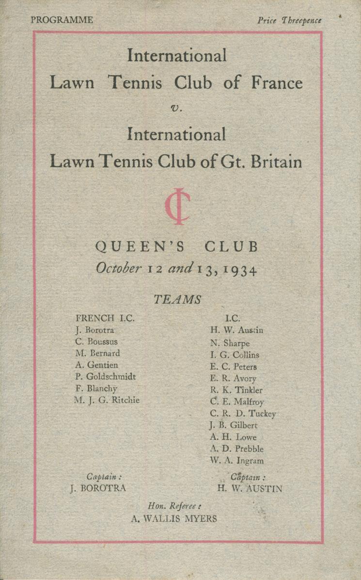 GREAT BRITAIN V FRANCE 1934 (QUEEN'S CLUB) TENNIS PROGRAMME