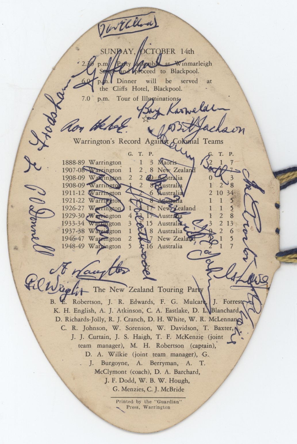 Menu card for a dinner held by Warrington RLFC in honour of the touring New Zealand team on October 13th, 1951. Earlier in the day The Kiwis defeated Warrington 19-13. Rugby ball shaped menu card, signed to the front in ink by at least 24 members of the touring party, including English, White, Robertson, Berryman, Eastlake, Davidson, Edwards, Atkinson, Barchard etc. Also signed to the reverse by at least 16 Warrington players, including Herbert, Jackson, Wright, O'Donnell, Bath, Fishwick etc.