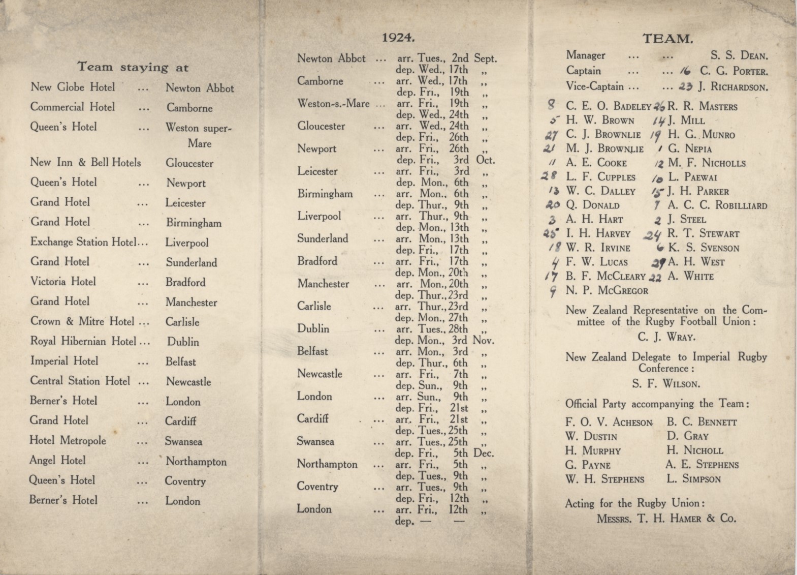 NEW ZEALAND RUGBY TOUR OF UNITED KINGDOM 1924-25 ITINERARY