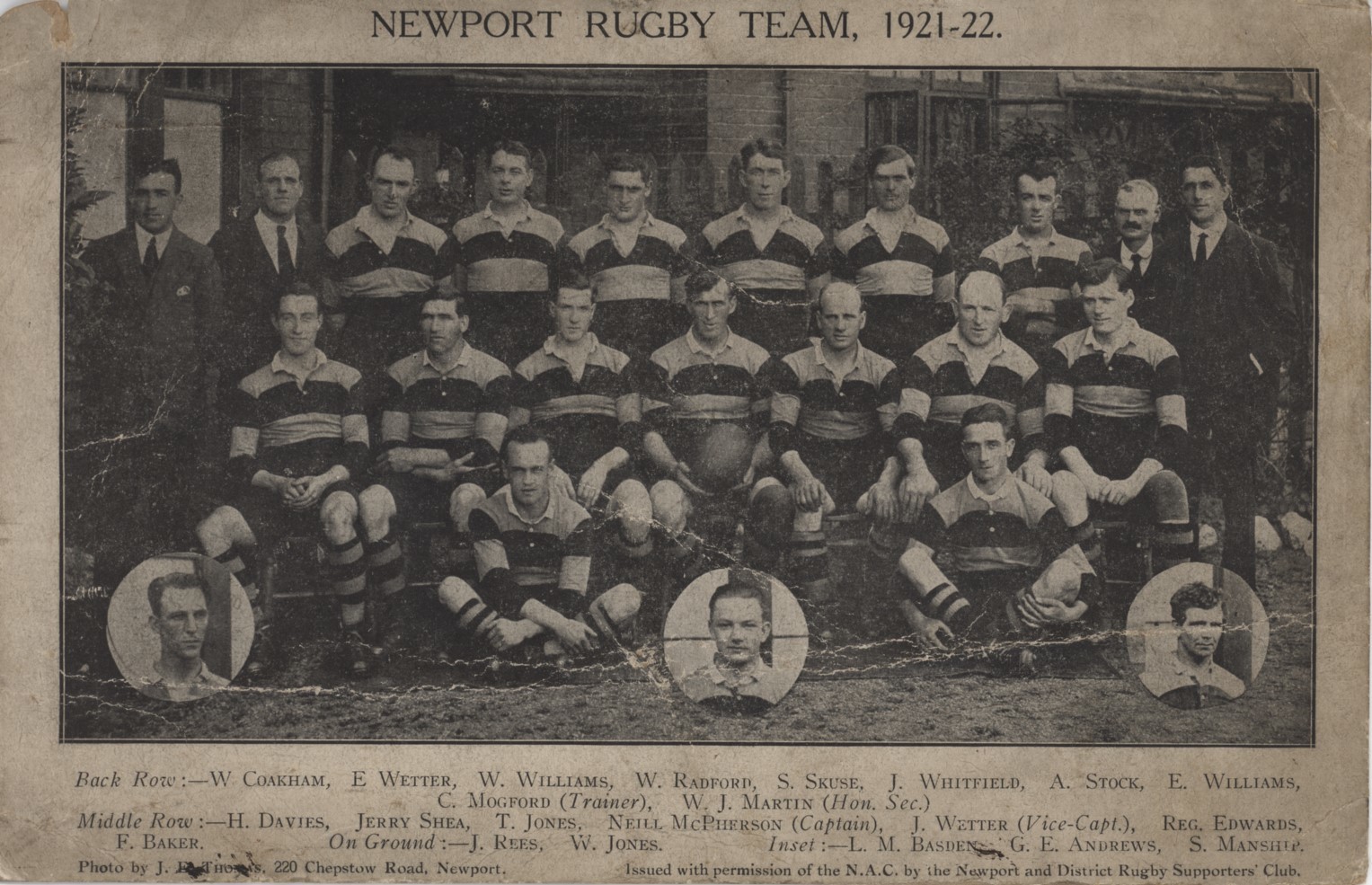 Photograph of the Newport Rugby Union team of 1921-22, printed on card and issued by the Newport and District Rugby Supporters' Club.