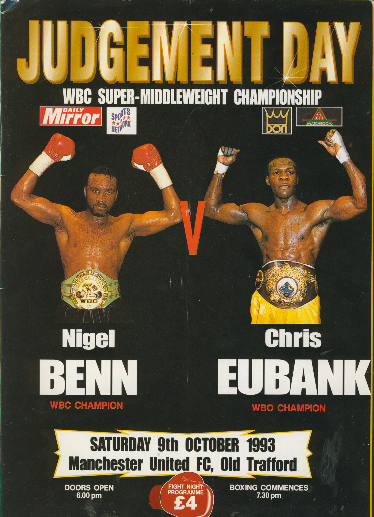 Official on-site souvenir program for the "Judgement Day" fight between Benn and Eubank for the WBC Super-Middleweight title, at Old Trafford, on October 9 1993. Over 40,000 fans crammed into Old Trafford, Manchester United's ground, for one of the biggest boxing events ever staged with more than half a billion people watching on TV. The fight did not quite reach the brutal heights of the first one, however, but there were flurries of punches at the end of the rounds as both boxers tried to win the rounds knowing there was more chance of the fight running the distance as the bout progressed. The final round was a thriller, with both boxers told they needed it to win. The final scores were 115-113 Eubank, 114-113 Benn, and 114-114. The bout was thus declared a draw meaning Benn retained his WBC belt, Eubank his WBO championship.